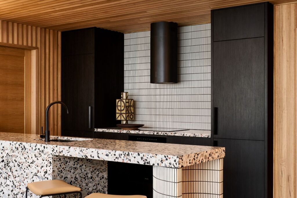 The kitchen is anchored by a sculptural terrazzo island, its form accentuated by kit kat-tiled detailing. Battened Tasmanian oak lining boards envelop the space, imparting a tactile warmth that counterbalances the high-rise setting while subtly referencing the owners’ childhood homes.
