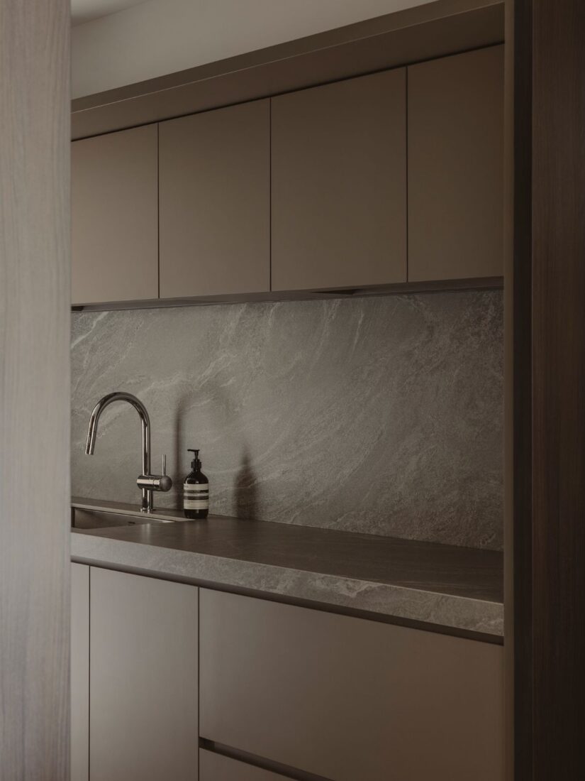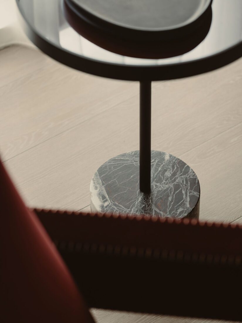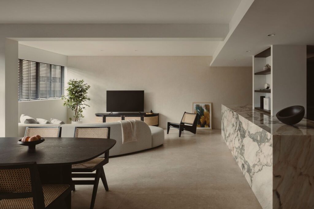 Beyond the necessary comfort of a striking interior, the homeowners also stated their preference for natural stones and a darker, richer material palette. To meet these requirements, Right Angle Studio opted for a very natural and earthy material selection, with woods and marbles dominating most of the spaces in the apartment. Taking the brief one step further, the designers created a key highlight at the heart of the flat’s public zone with the introduction of an elongated marble counter wrapped in bianco chiara finish, inspiring its project name.