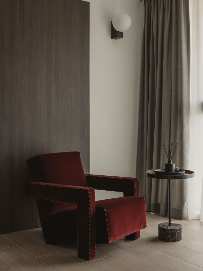The walk-in lounge became another interesting spatial planning feature. Positioned as a transitional space connecting the wardrobe and the master bedroom, its concept aimed to offer a cosy retreat for the homeowners to relax after a hectic day. Upon entering through the swing door, the designers placed a pair of Cassina Utrecht loungers by Gerrit Thomas Rietveld, complemented by accent lighting from Astro, to create an intimate and chic relaxation nook to bring in an ultimate feeling of zen.