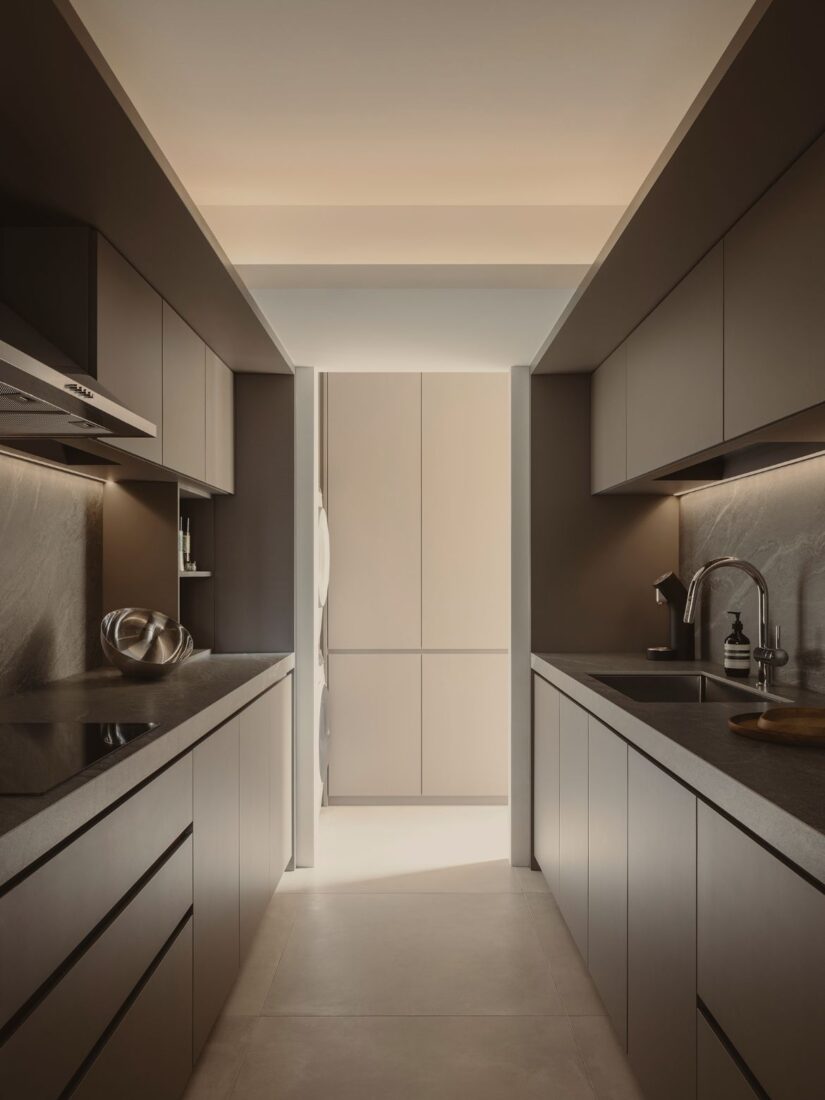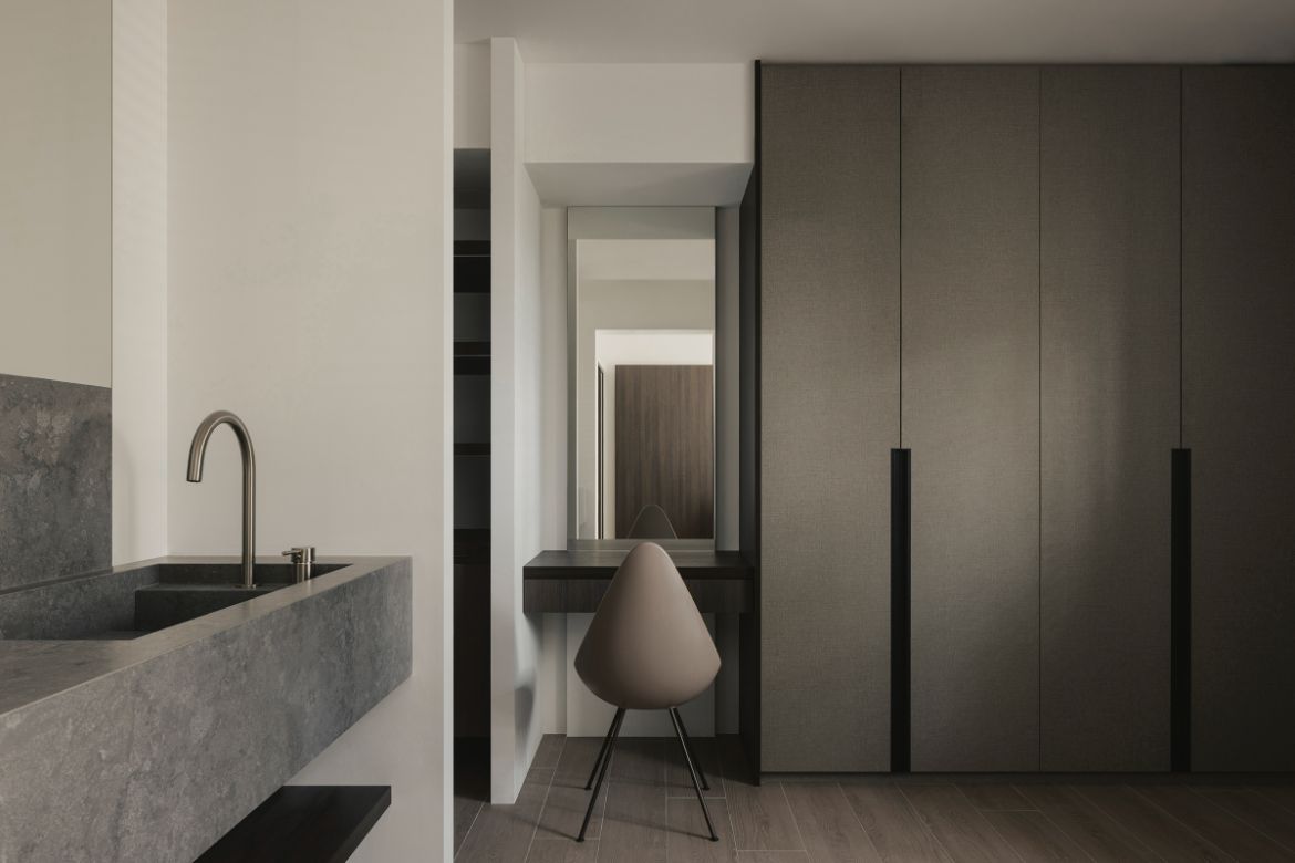 Throughout the apartment, the designers took a balanced approach of utilising a restrained material palette and clever spatial planning solutions, implemented in interesting and inventive ways. For the walk-in wardrobe room, Alex and Jay suggested relocating the vanity outside, integrating it with the dresser table and workstation, adding an intriguing feature. This arrangement elegantly freed up space in the master washroom, ensuring it felt spacious and unconfined.
