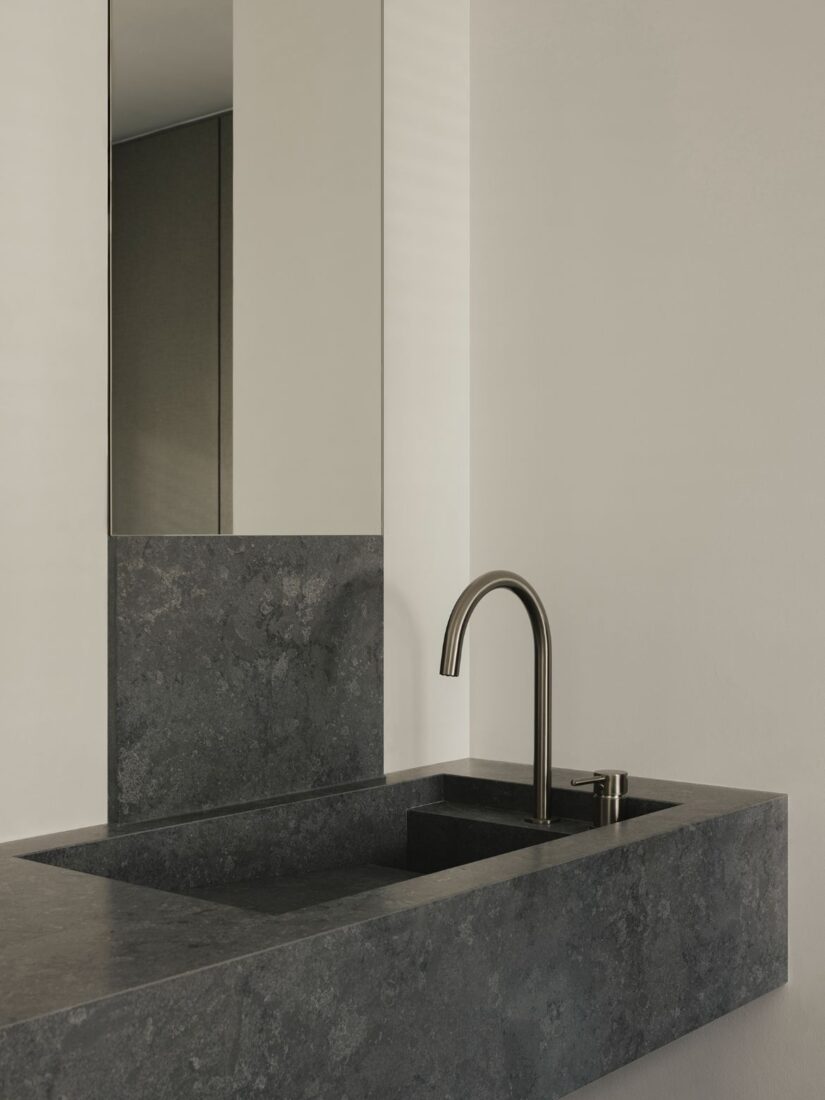 With a clear divide between public and private areas and a strong design language, the Monolith apartment by Right Angle Studio strikes a balance between expressive material textures and muted, earthy colour palette.