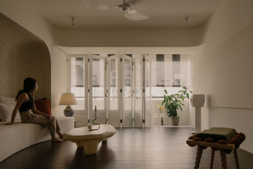 Natural materials and touches of the organic resonate with the naturalistic and cocoon-like interior. Daylight floods in from the balcony when the timber folding doors are pulled back, and one can appreciate the retro elements such as the ventilation blocks and black and white bamboo blinds as reminders of the decades-old apartment’s origins.