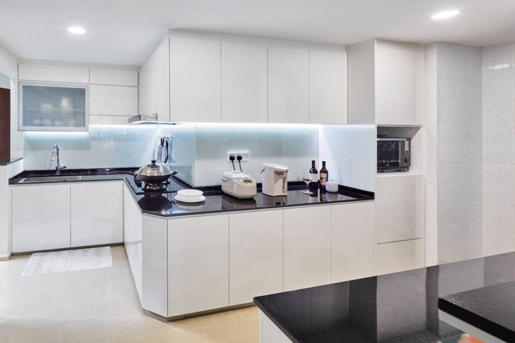 The heart of the home is also the design highlight of the space. With the counters set in a Z-shaped arrangement, the design team further enhanced the unique setting with LED lighting that serves as both task and ambient lighting. Completing the look of modern sophistication is the classy pairing of granite worktops with pristine white laminate cabinets.