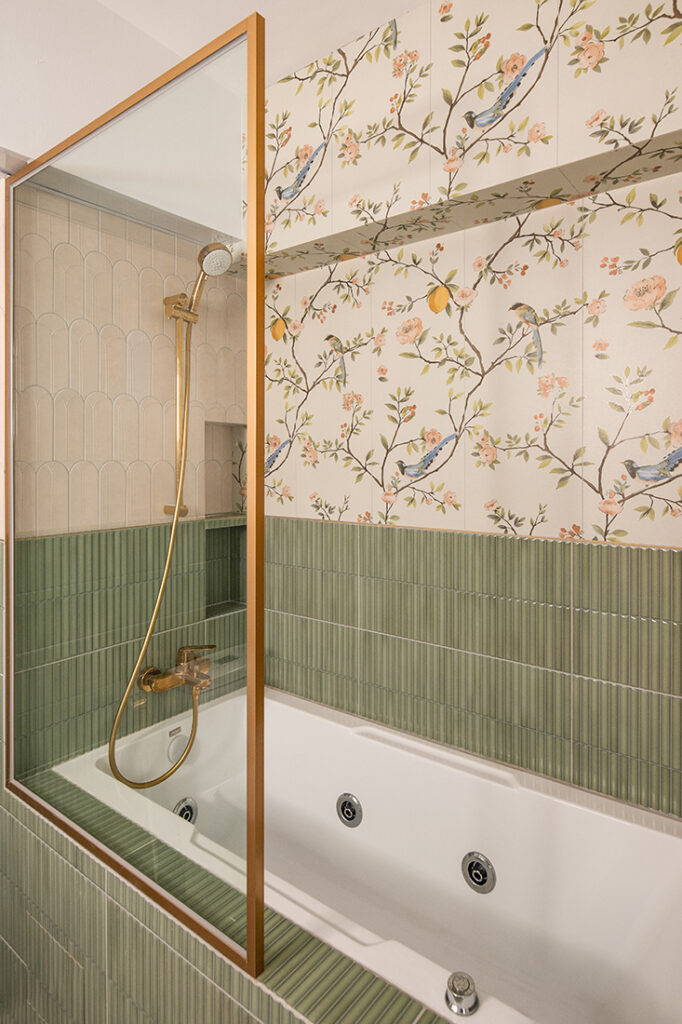 The bathrooms are where her designer’s instinct for balance shines most. The master bath is playful yet composed, combining green kit-kat, pink scallop and chinoiserie-inspired tiles, as well as gold accents. The common bath echoes the home’s black-and-white restraint in quieter tones, creating cohesion without repetition.