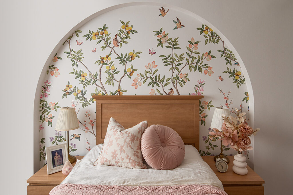 Each bedroom reflects the individuality of its occupant. The master takes on a tropical, resort-like softness with botanical wallpaper and colonial-style furnishings. The sons’ shared room expresses an industrial energy with brick-pattern wallpaper and black task lamps, divided by a bookshelf for privacy, while her daughter’s room introduces soft curves and a pink arched mural for a whimsical touch.