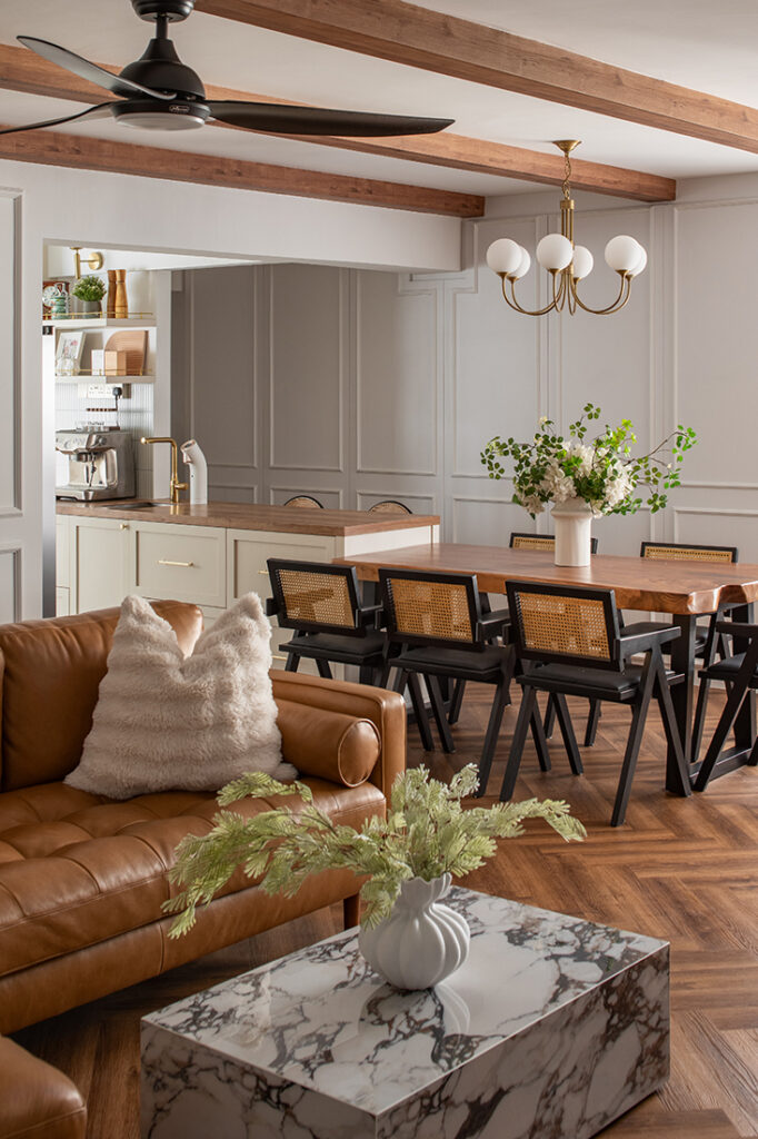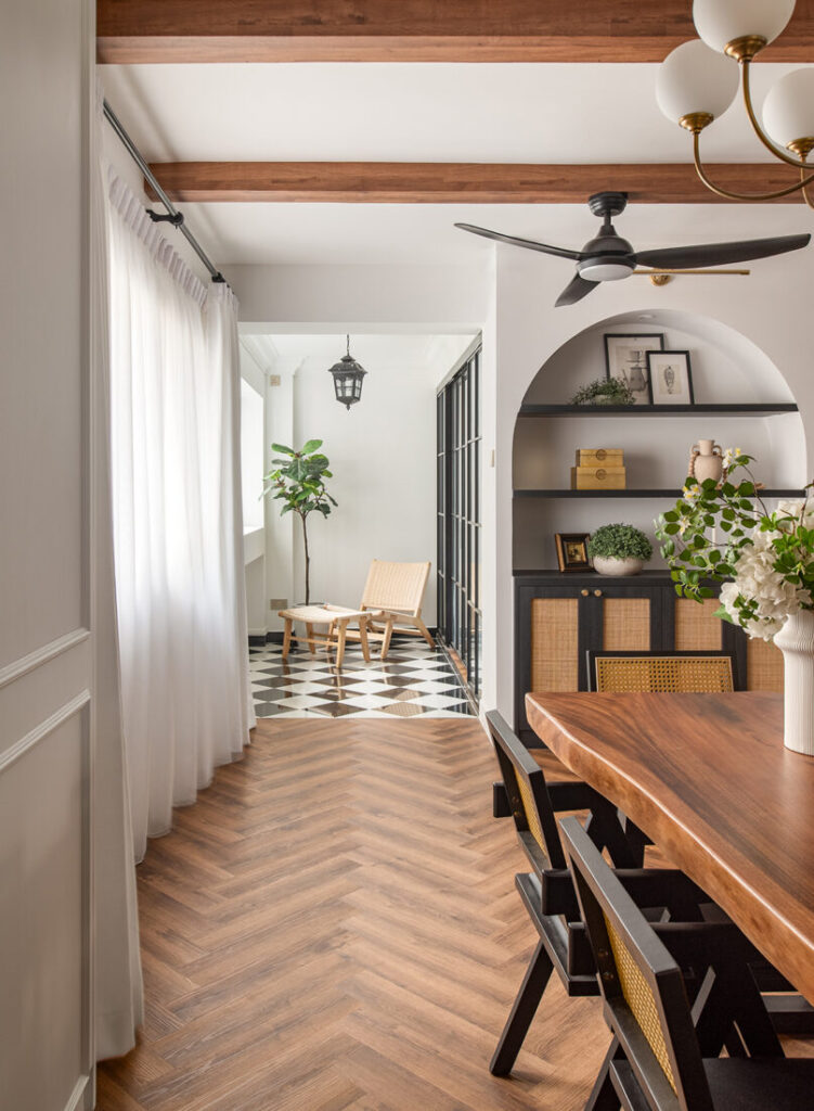 The 1,604-square-foot flat is designed to accommodate a bustling household of six – plus Chloe the dog. Poh Ling drew from a familiar muse: the Cameron Highlands Resort, a family favourite that left an impression with its colonial-style interiors. Rather than replicating its look completely, she channelled its calm — wainscotting, dark timber tones, rattan panels and brass lighting — softened with warm neutrals and herringbone vinyl flooring. The result feels layered yet measured: polished enough to impress, but relaxed enough for everyday living.