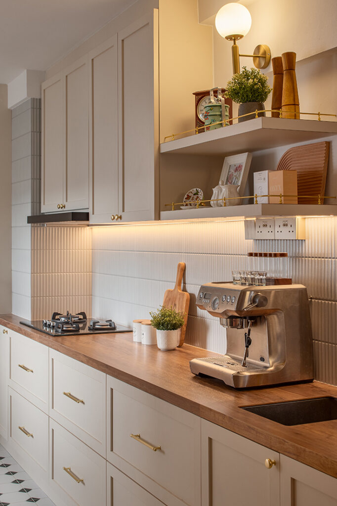 The open kitchen now extends from the dining area, brightened with cream cabinetry, wooden countertops and white kit-kat tiles. Every inch was designed for family practicality: the washing machine and dryer are tucked away in cabinets, and the small peninsula (which is connected to the dining table) has its own sink and doubles as both a prep zone and dedicated coffee station for Poh Ling’s son. It’s a hardworking, elegant space that supports family life without clutter.