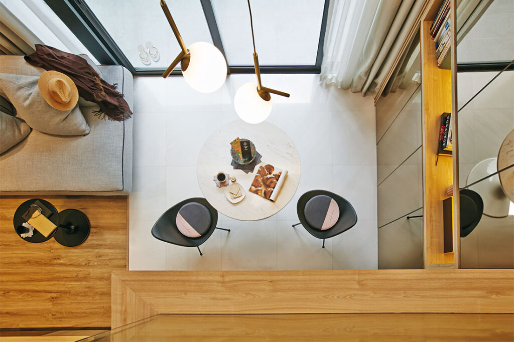 Compact living in the city can be a challenge, but the single lady residing in this 570-square-foot shoebox apartment is living the high life in a home that’s been purpose built around her needs. From the vantage point of the mezzanine, one can enjoy a full aerial view of an enlarged dining/living space thanks to the removal of the walls to the original study. “This has effectively addressed the tight layout. With the living area now moved to where the study once stood, it made it possible to carve out a proper dining space next to the kitchen,” says interior designer Json Er from Design of Schatz.