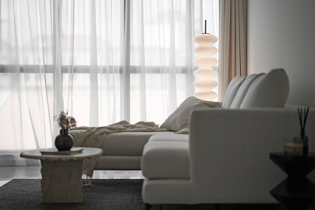 Light spills in through the full-height windows to softly illuminate the living area. This space exudes quiet and effortless elegance with a few simple but well-chosen furnishings, like the comfortable and deep-seated sofa for lazy days in.