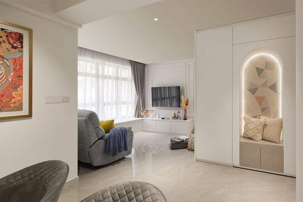 The choice of a simple, pristine white palette immediately makes this Bidadari flat feel incredibly spacious, bright and calming. It also draws easy attention to characterful design elements, like the elegant wall mouldings in the living area, and the playful, cosy settee. The latter holds a secret too – it conceals the entrance to the household shelter.