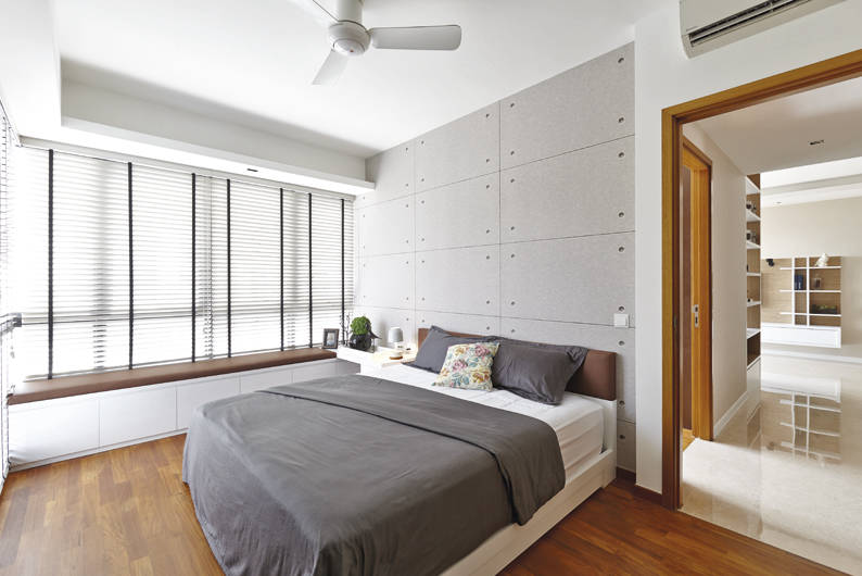 The streamlined carpentry is yet another way to make the most of a small space. The designers customised all the shelves, cupboards and cabinets to make sure that no wasted space is left over. The best example can be seen in the bedroom, where bay shelves are lined along the windows to make use of the wall-to-wall window span.