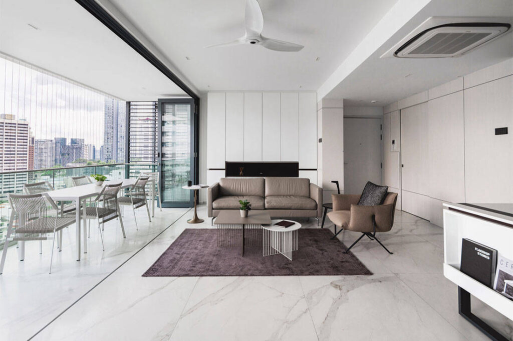 A predominantly white and neutral colour palette along with reflective surfaces enhances the perception of space in the communal areas. The generously-sized balcony has been fully furnished to accommodate friends and family comfortably. When the bi-fold panels (which replaces the original sliding doors) to the balcony are fully drawn back, the line between outdoors and indoors dissolves and the family gets to enjoy an even larger living room.