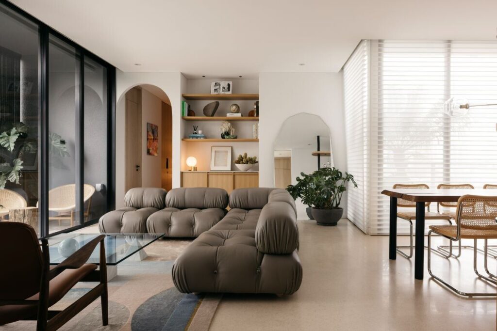 Personality is added to the interior with arched doorways and alcoves. At the arched opening in the living area, the floor finish changes to oak timber, drawing focus to an arched display shelf at the end of the corridor.