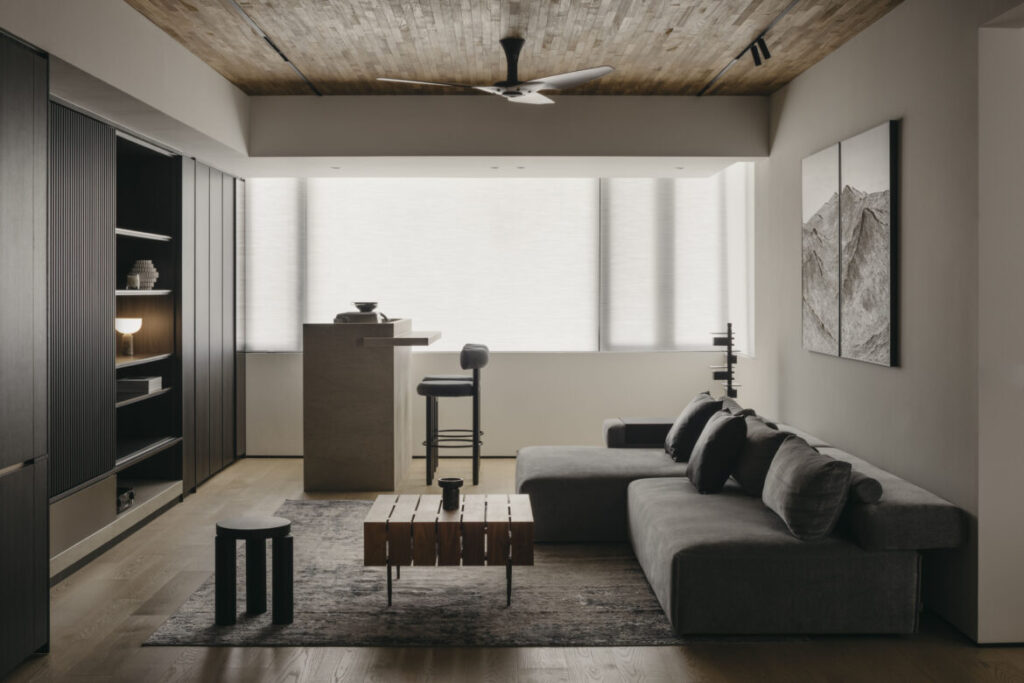 Accompanied by a solid timber-clad ceiling, the atmosphere is immediately inviting. Facing the sofa, a full-height cabinet is finished with a darker stain of wood veneer. “The veneer’s deep, rich tone complements the space’s modern aesthetic. It lends a touch of sophistication to the joinery, enhancing its visual appeal and creating a focal point within the room,” Jerry describes.