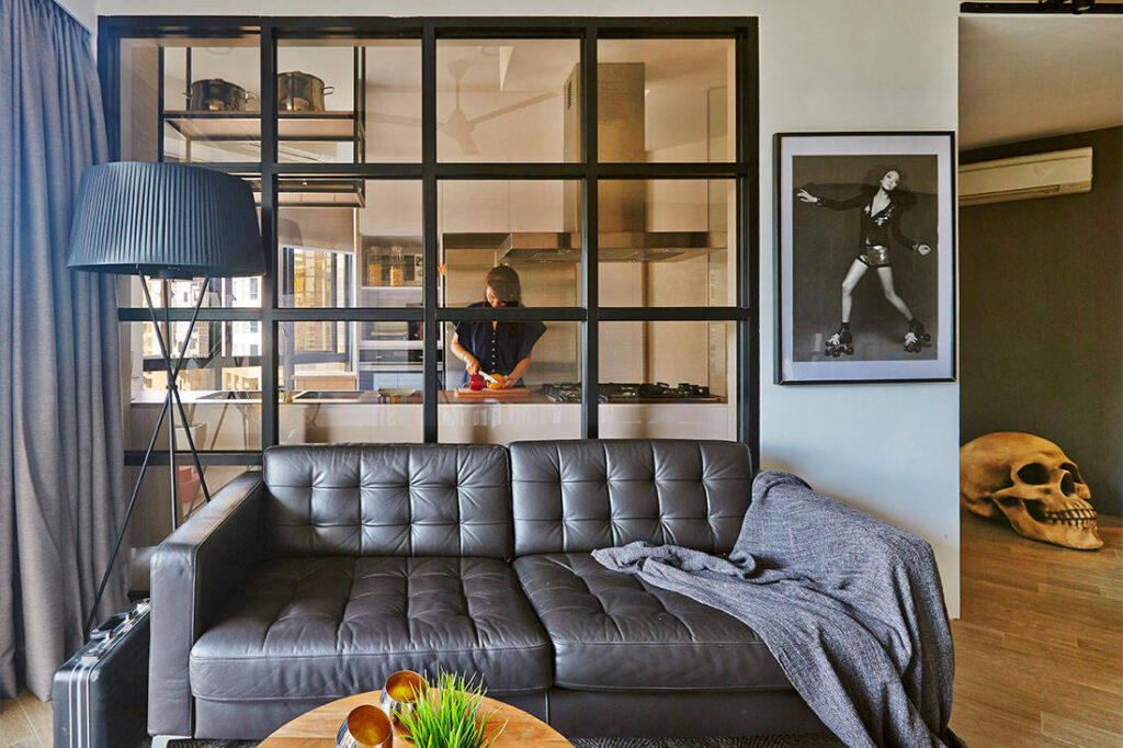 “The homeowners love to cook and entertain,” reveals the design team. That culminated in them proposing to situate the semi open-concept kitchen right behind the living area. With aluminium partitions and glass panels perfectly framing the cookspace, the gregarious homeowners get a good view of the TV and can maintain interaction with guests in their living area.