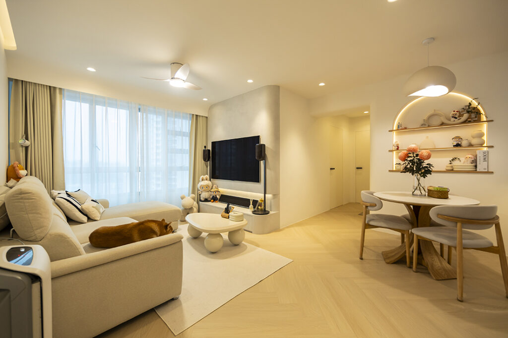 Curves take the spotlight in this softly contoured 4-room HDB flat, crafted for a stylish young couple who favour gentle flow over rigid lines. From arched ceilings to rounded carpentry details, every aspect was carefully woven together by Senior Designer Marcus Chong of Woodcraft Interior Design to create a space that feels flowing and effortlessly inviting.