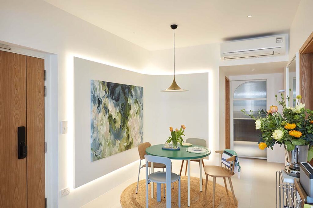 Home to an avid art collector and her dog, this Bukit Timah condo was shaped by a clear yet creative brief: turn the dim and dated space into a bright, gallery-inspired haven. Her designers from R+ Studio delivered and reimagined the home as a light-filled canvas, with a standout curved dining wall complete with LED lighting doubling as both art display and an entertaining space.