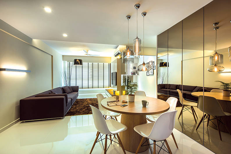 Many Singaporeans believe that there’s a huge difference between the interior design of a condominium apartment and an HDB flat. This however, isn’t necessarily true. In this 5-room HDB flat, the designers from Ciseern managed to visually open up the interiors to give a bright and airy feel that’s usually associated with large condos. One of the biggest contributors to this light-filled home is the clear glass wall that replaces the wall between living room and study room. With no walls to confine the rooms, light can flow freely between the living and dining areas.
