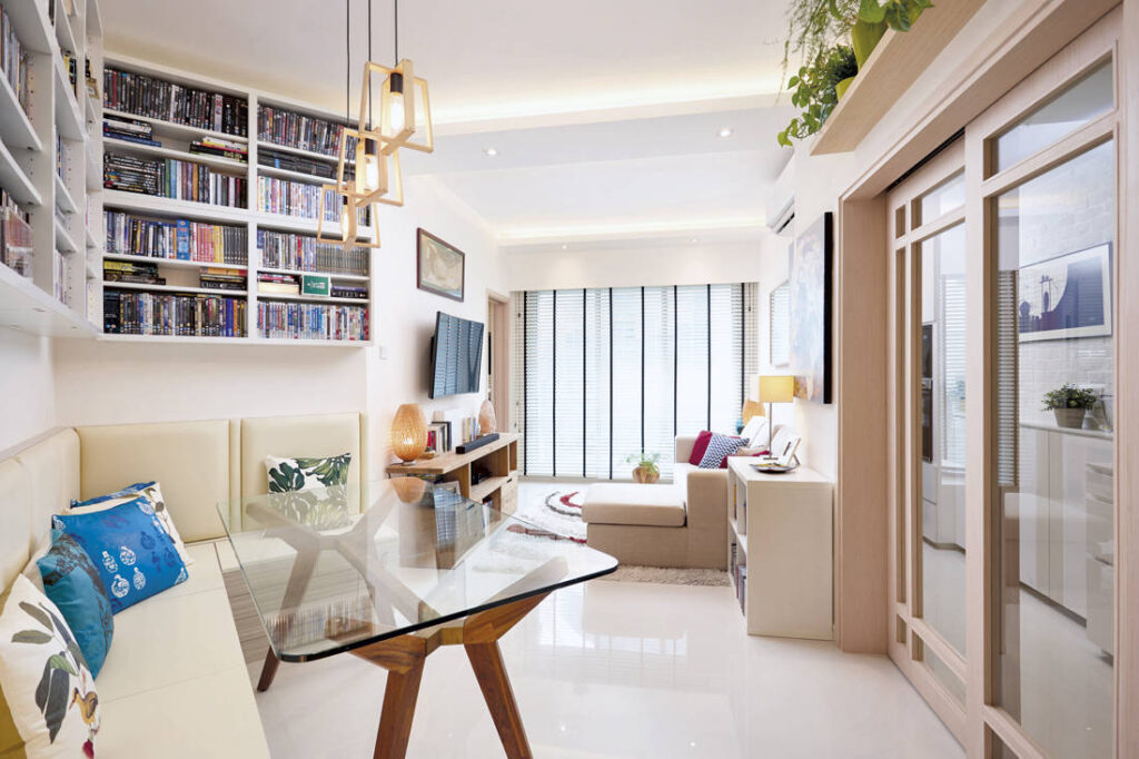 Besides the issue of limited space, this one-bedder features an awkward layout with odd angles. This meant having to work around unsightly recesses such as that of the dining area. The designer made it less jarring by incorporating a settee and installing shelves for storage. This approach further maximised available space. Likewise, the enlarged kitchen entrance creates the illusion of space but can still be closed off with sliding pocket doors when needed.