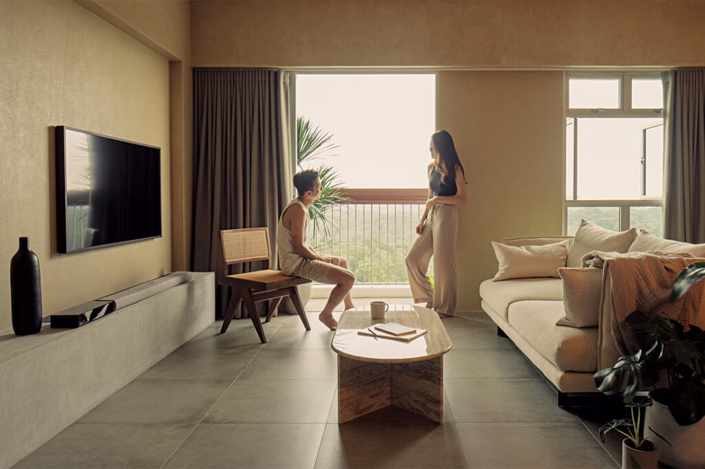 Affectionately named The Heartland Cave, this five-room HDB flat is the dream home for slow living. Designed by Open Studio for a young couple working in the finance industry, the spaces are defined by a ‘tropical brutalist’ aesthetic with raw concrete elements softened by lush greenery and warm colours.