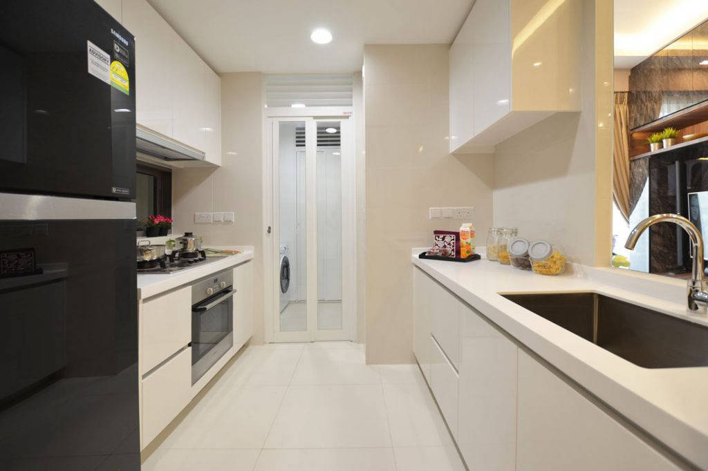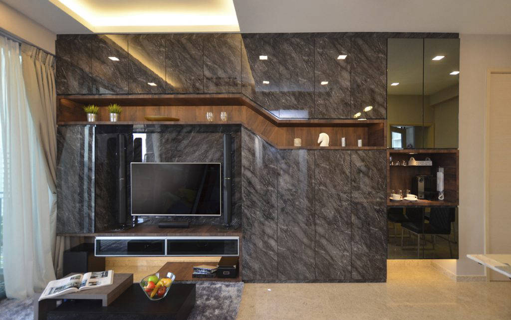The idea was also to craft a standout feature in the living area. With dark glossy marble-look laminates, Joel Chan and her team at Home for Life Associates built a feature that incorporated a host of storage solutions. A niche runs across the feature, giving the couple space to display photographs and small decorative items. “The long display niche in the living area’s wall unit is a challenge in creativity and carpentry skills,” says Joel. The result is a dynamic feature.