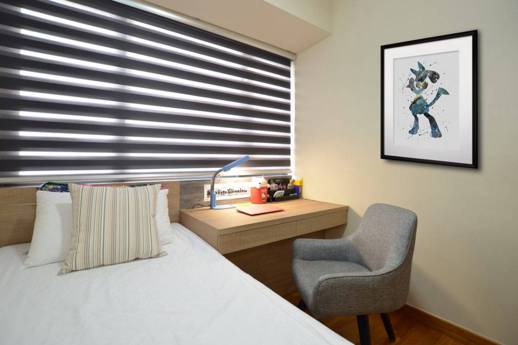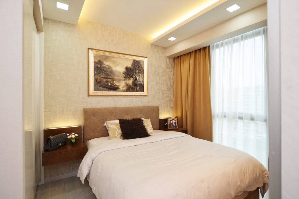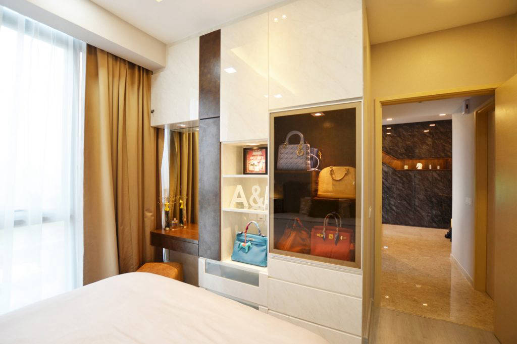 Space is the biggest challenge for this project. Therefore, from the foyer to the bedrooms, the design team’s focus is on built-in features that multitask. In the master bedroom, a multi-functional custom storage unit supplements the storage provided by the wardrobe. In addition to the covered storage units, there are also glass-fronted display shelves for handbags and open shelves for daily used items. The team incorporated a compact vanity area by the window with a drawer so that things can be stowed away when not in use. Patterned wallpaper dresses up the room, where the team has designed cantilevered bedside tables to free up floor space. The lighting strategy is to have cove lighting on the ceiling and at the bedside tables to add depth.