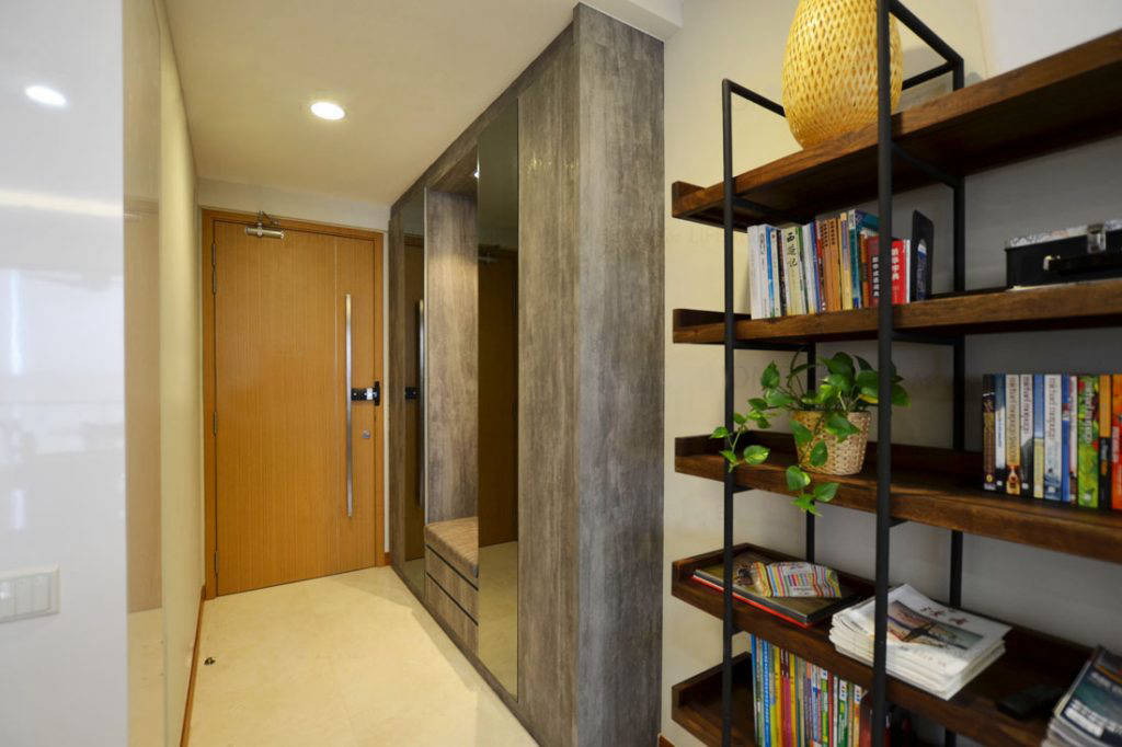 The 800sqft apartment comes with two bedrooms and lots of full-height windows that enable natural light to enter the home easily. The spatial experience begins in the foyer. The dark-coloured custom storage unit for shoes and miscellaneous items is combined with a seating area.