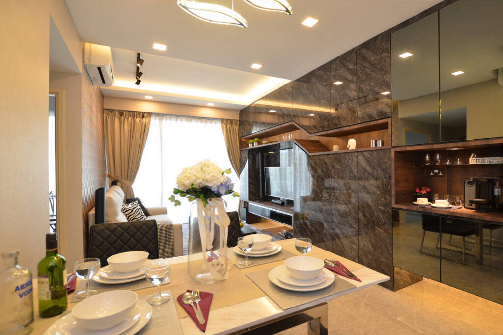 Sharing this space is the dining area, furnished in light hues to balance out the dark surfaces in the living area. Placing the table against the wall frees up space for ease of movement. Due to its location away from the window, the area is fitted with additional lighting in the form of pendant lights.