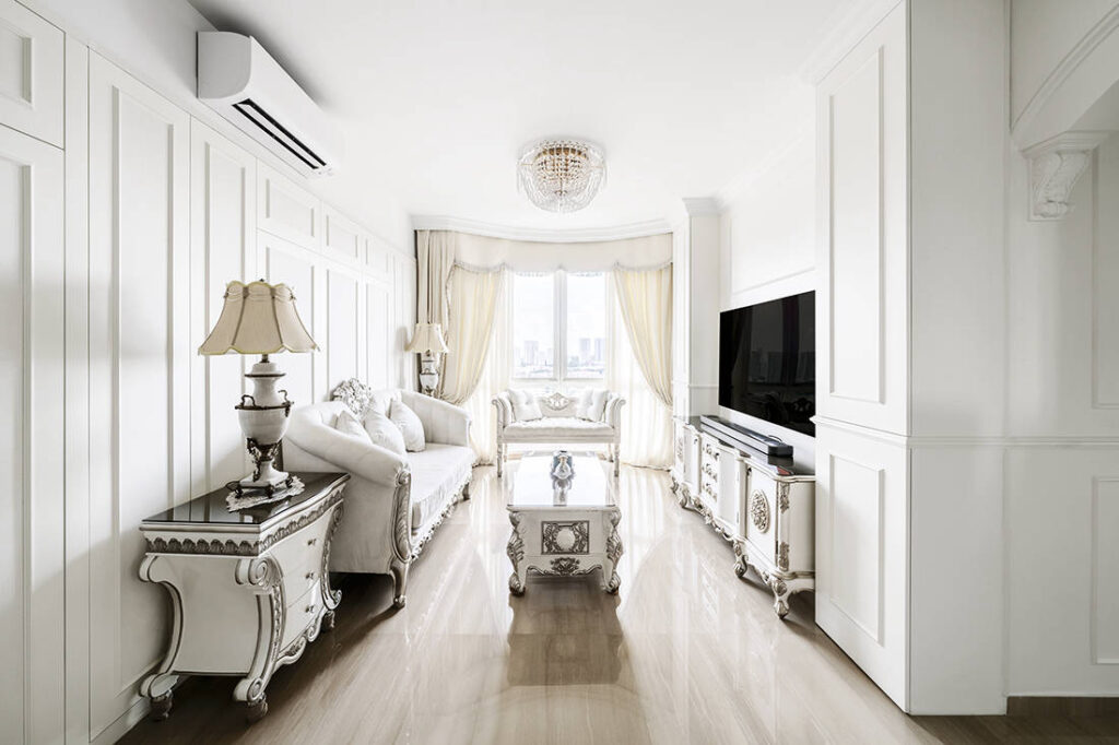 The homeowners enjoy the finer things in life, and as such, wanted a distinctive look for their family home. As seen in the living room, every surface of the apartment is clad in white detailing that lend to the sense of classic Victorian glamour. The designers even managed to install a hidden work desk that can be pulled out from within the concealed pocket doors.