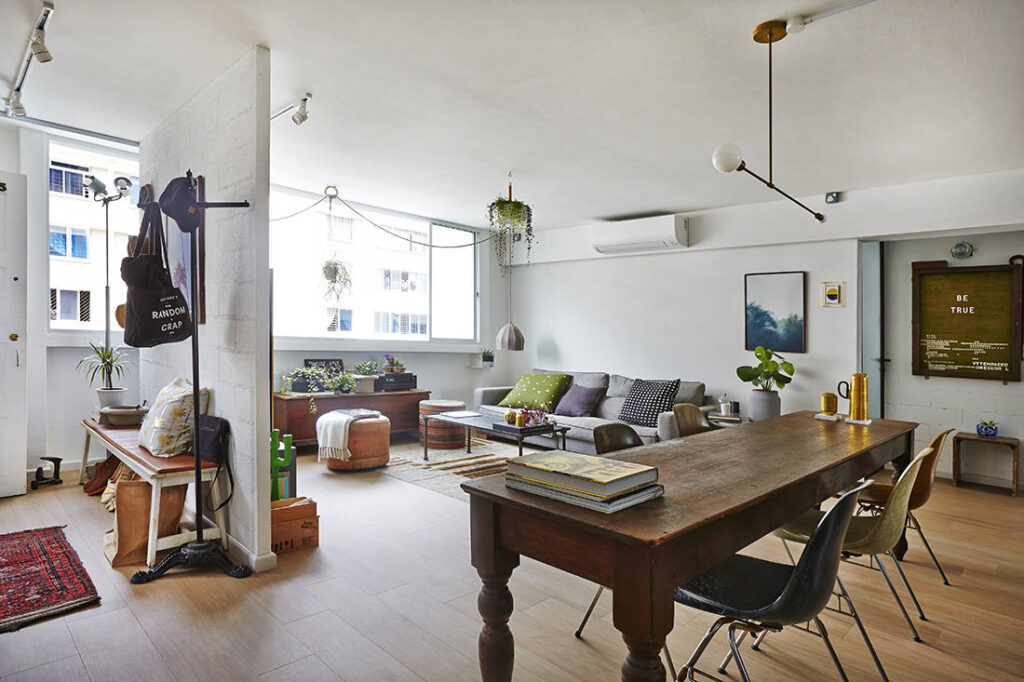 Sourcing for preloved furnishings could well be homeowner Chloe’s second forte, after her day job as a food photographer. Her first home with husband and fellow shutterbug Dominic is a cosy hodgepodge of interesting second-hand pieces. As she points out excitedly where and how she chanced upon certain noteworthy items, she reveals that her hunt for vintage furniture started long before their resale flat was even purchased.