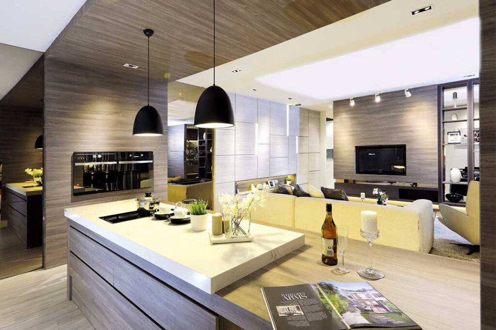 Unlike the open scheme found in the kitchen and living area, the dining zone is housed in a raised platform ‘room’ with the timber-look ceiling, vinyl wood-look flooring and pendant lamps bringing forth a cosy and more intimate ambiance. Elegant touches take the form of clean-lined furnishings and a brown tinted full-length mirror (also featured in the kitchen), which visually enhances the space.