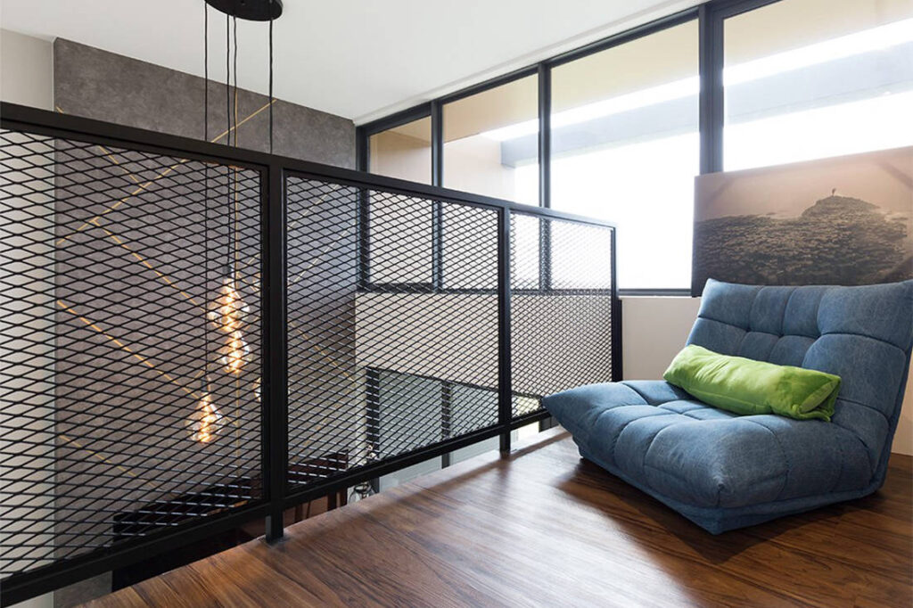 The second storey loft is the perfect place to curl up with a good book and get fully absorbed into it. The custom perforated metal grille for the loft adds an industrial touch to this space while gelling with the overarching theme. The vinyl flooring in this area is also used in the bedrooms.