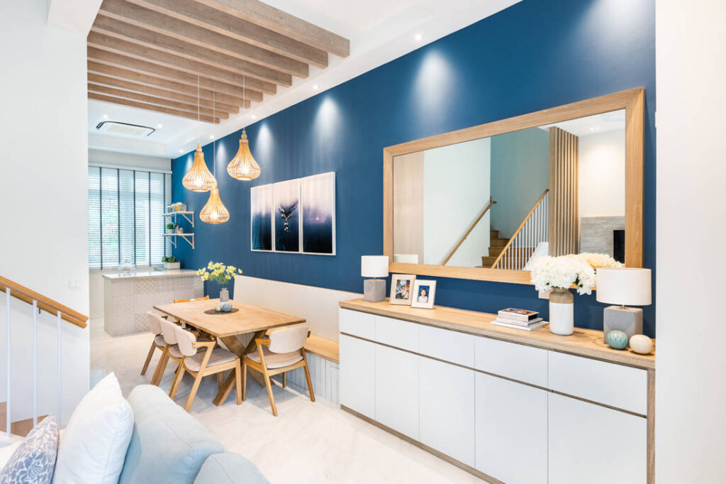 To demarcate the dining area from the living area and dry kitchen, the designer chose a striking shot of cobalt blue and teamed it with white colour and wood accents. The entire wall receives a two-tone treatment of blue paint, as well as wood and white laminates which clad the built-in carpentry works. A sideboard was also built to seamlessly integrate with the dining bench that boasts storage beneath. Timber strips are also added to the ceiling. Megan says: “They add depth to the ceiling and demarcate the dining area, but still maintain the spacious and airy look.”