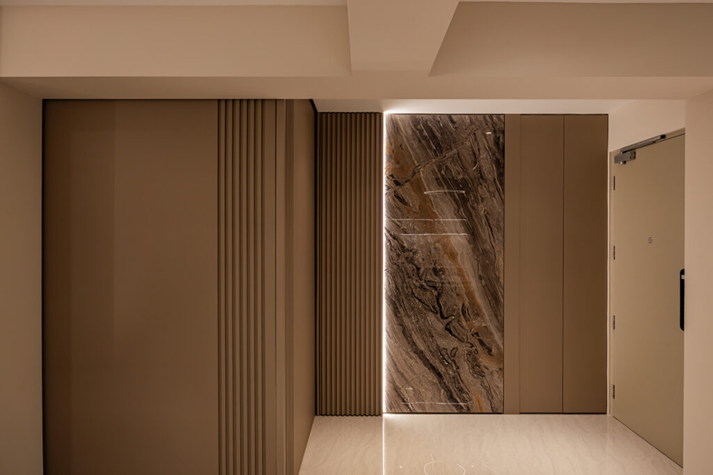 From the entry, the household shelter and shoe cabinet are neatly concealed behind matching finishes, anchored by a sintered-stone feature with elegant marble veining.